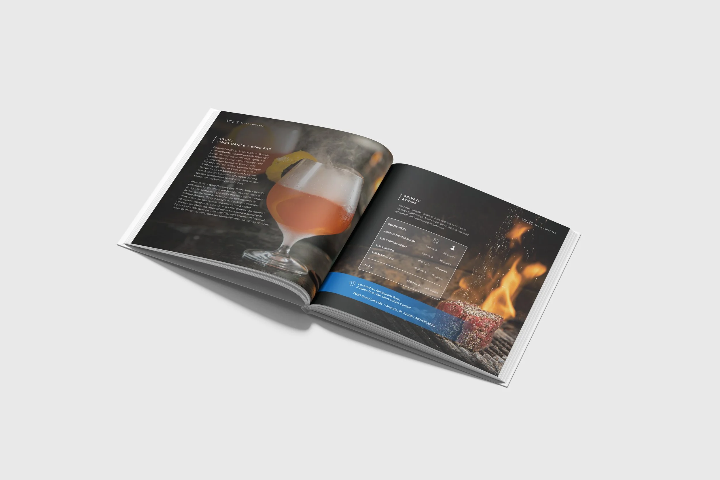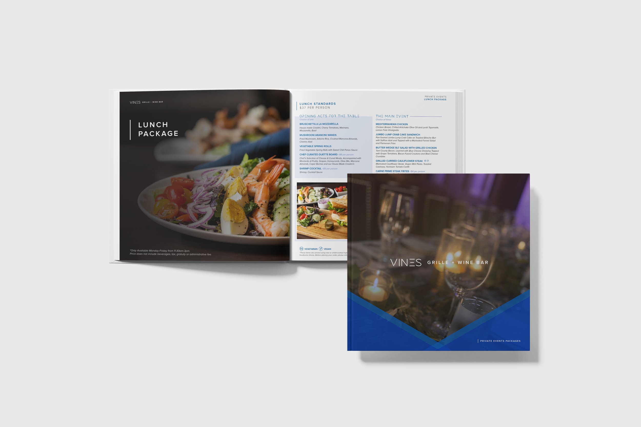 Work was completed by Brandcoders in Orlando, FL for Vines Grille. This brochure was created for Vines Grille in Orlando, FL to show the different catering packages for private events held at their restaurant. Christie Lee designed and updated the Private Events deck following the brand guidelines already in place for Vines Grille.